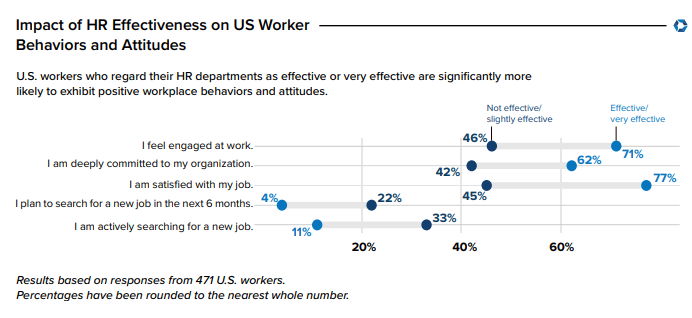 According to a SHRM survey, 71% of more engaged employees say their HR is effective or very effective. Engaged employees are happy employees, and they make a productive team.