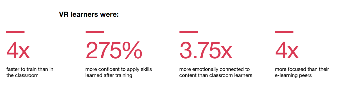 - Virtual reality delivers. A PwC study found that VR learners completed soft-skill training 4x faster and reported greater confidence in applying those skills than classroom learners