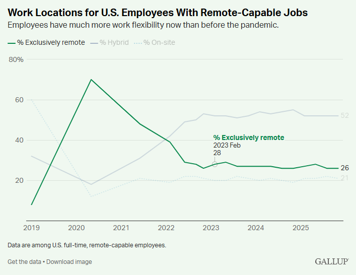 Hybrid work has settled into a rhythm in some places, with 52% of employees in the US preferring it over in-office options.