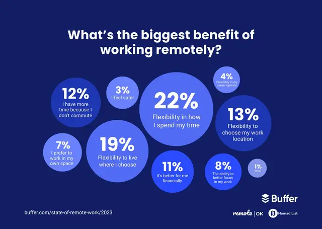 Clear outcomes, flexible hours, asynchronous collaboration, and respectful boundaries enable people to design their day for focused work when they're sharpest. That explains why 92% of respondents in a Buffer survey say they will recommend remote work to others.