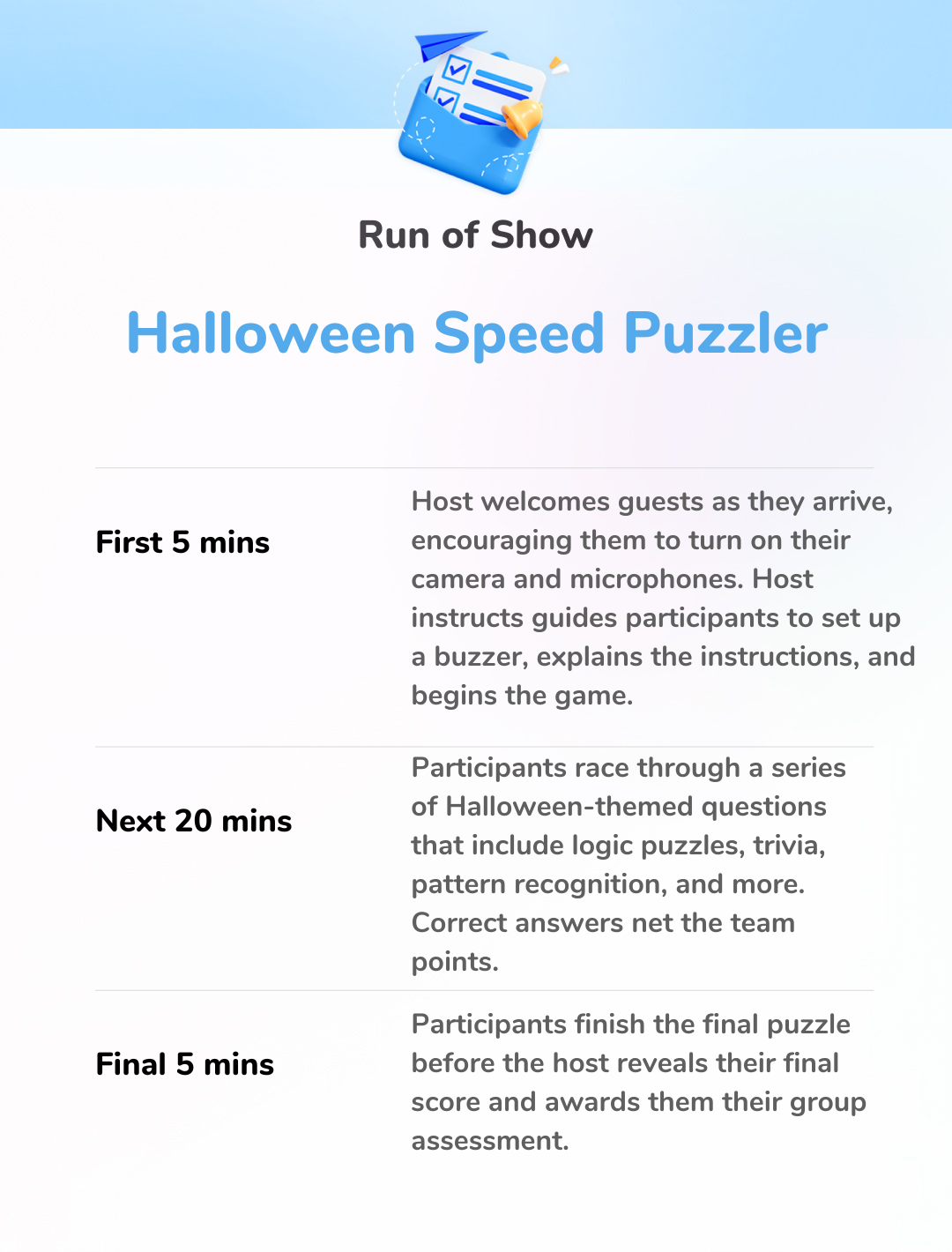 Your team has been summoned to take part in a classified Halloween challenge, where youโll square off in a series of spine-tingling (but totally fun) puzzles and brain teasers.