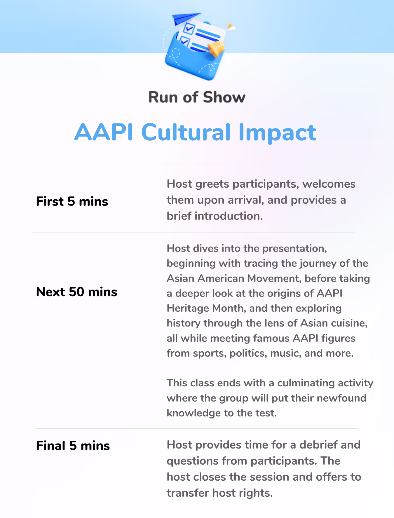 Our host was SO good at teaching us about AAPI cultural impact in a fun and engaging way! Each participant learned something new and enjoyed their time while learning.