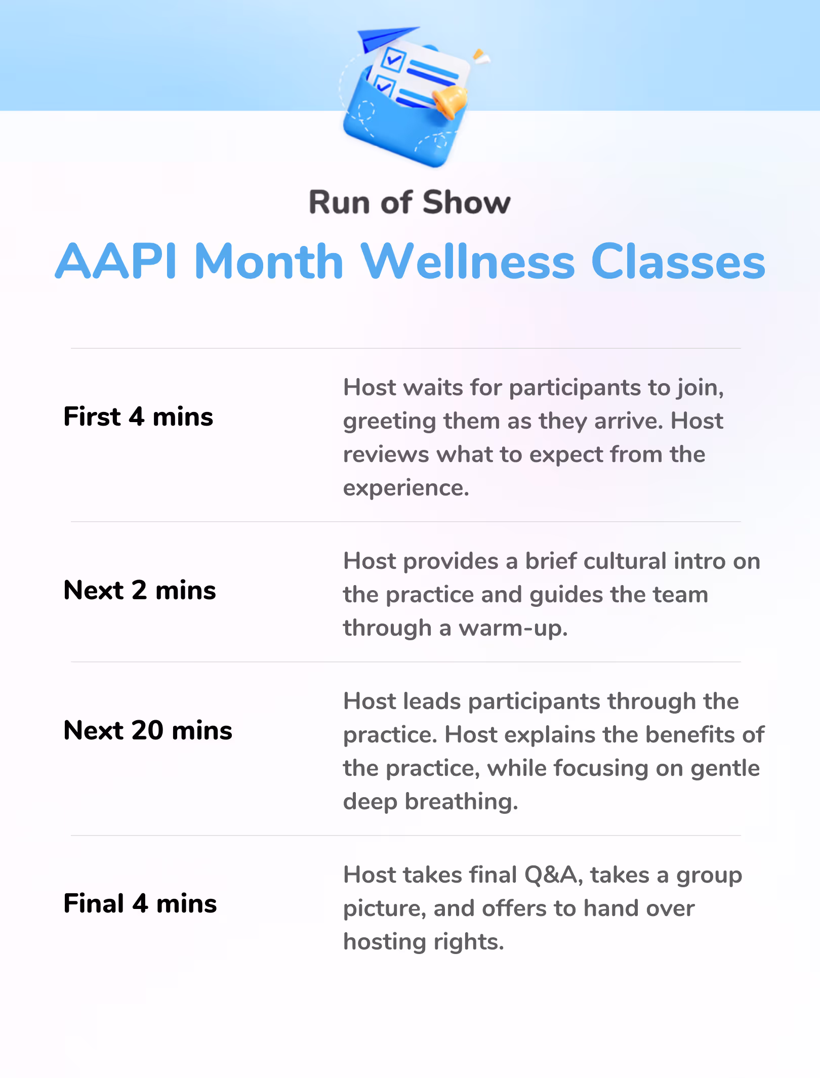 Perfect for a quick midday recharge or end of the day wind-down with your team. See the run of show.