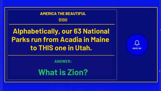 Jeoparty flips the trivia format on its head by presenting answers and asking players to give the QUESTION that matches it. For example, if the answer presented is: “The design on the American flag," the player would respond with, “What are stars and stripes?”
