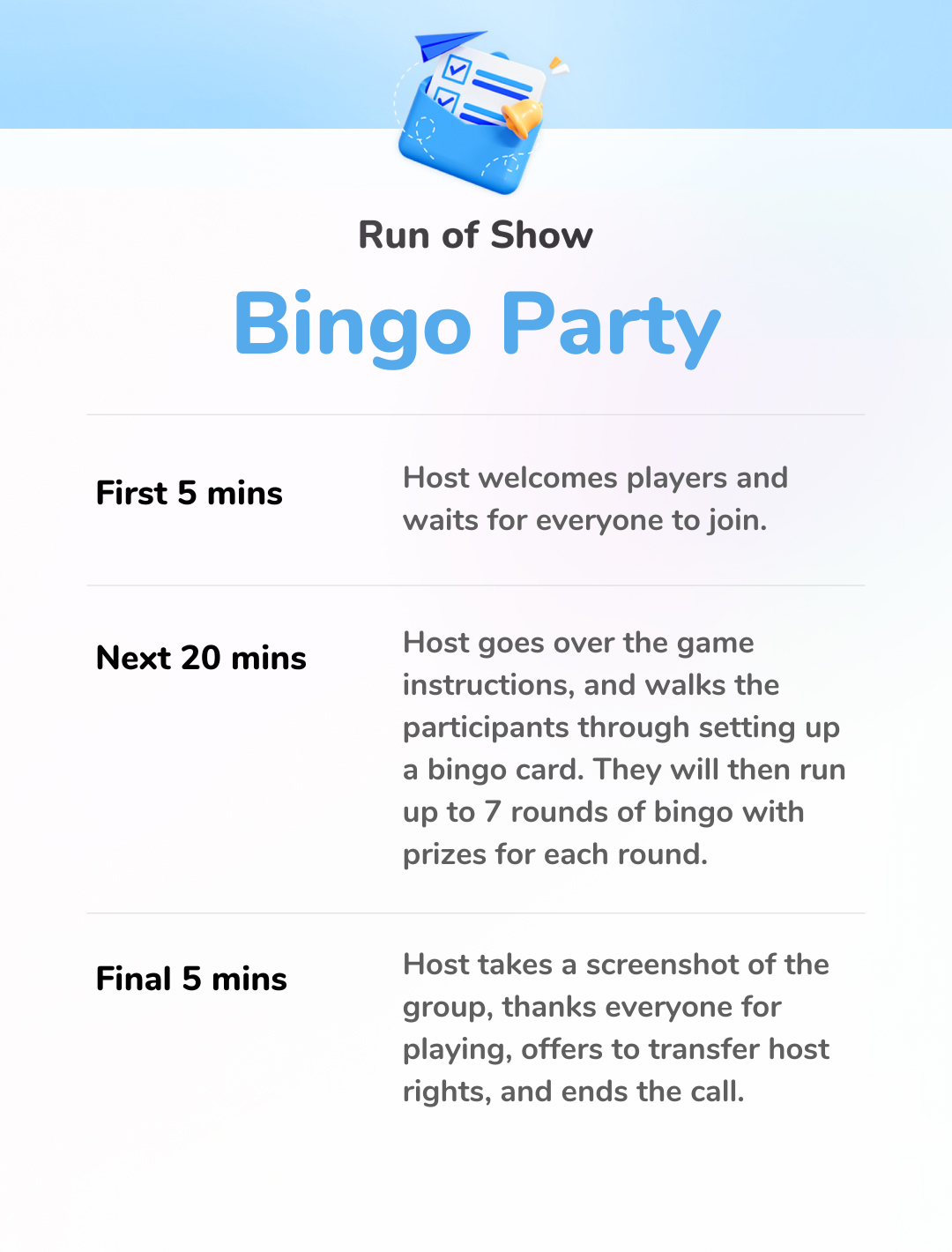 An engaging host will lead up to seven rounds of bingo, announcing random letters and numbers for players to cross off their digital bingo card.