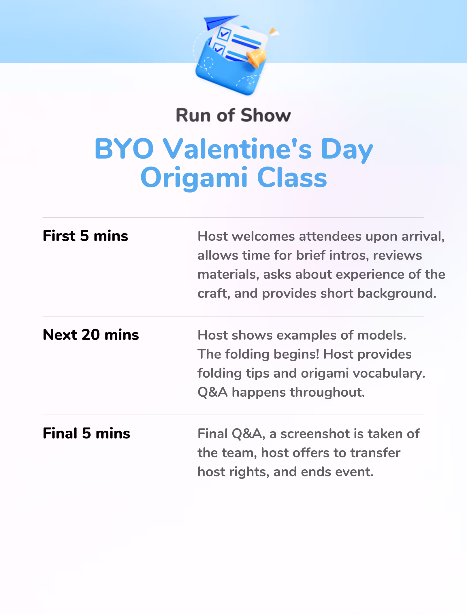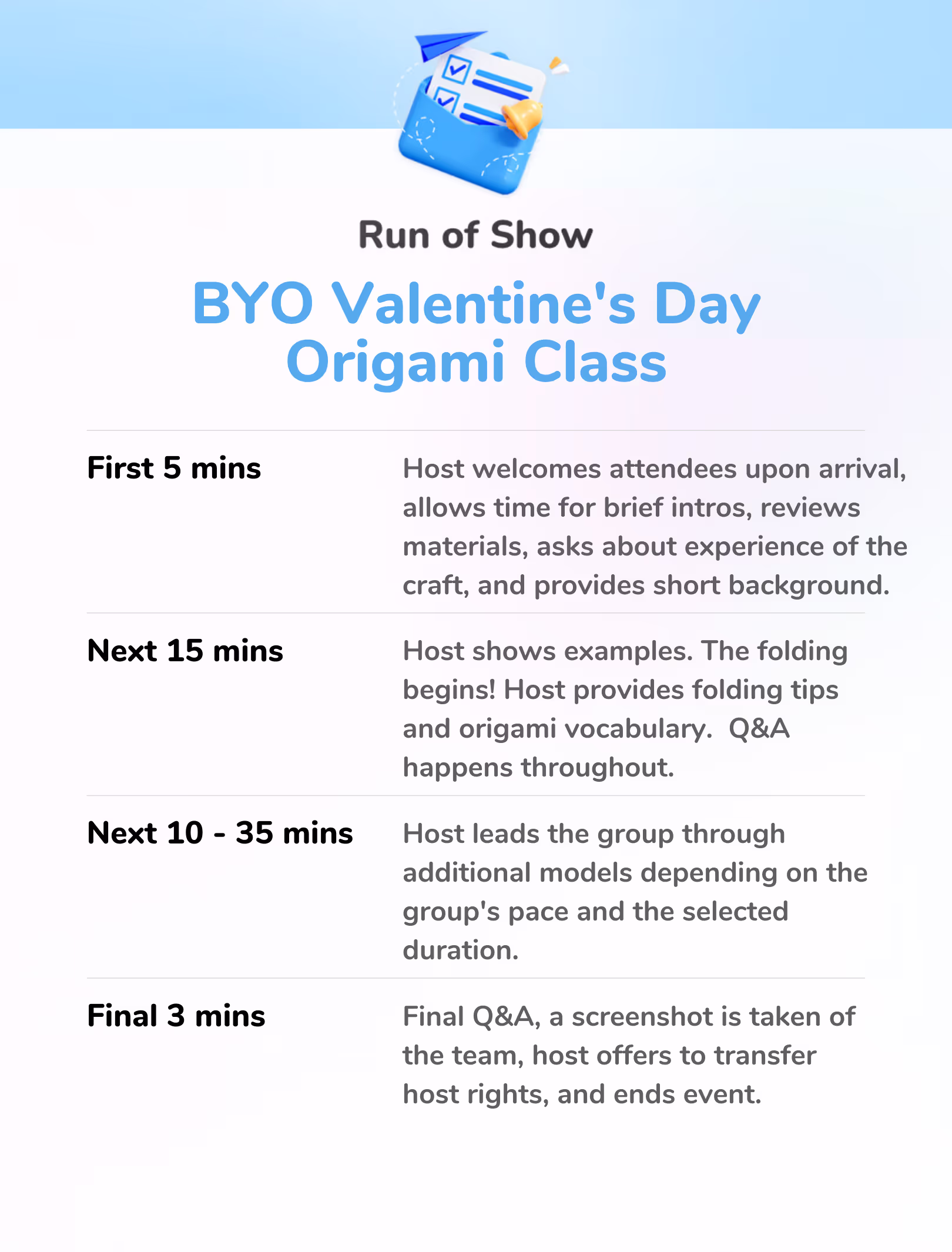 Short on time? Learn the basics of origami in this short and sweet version of our standard class. See the run of show.