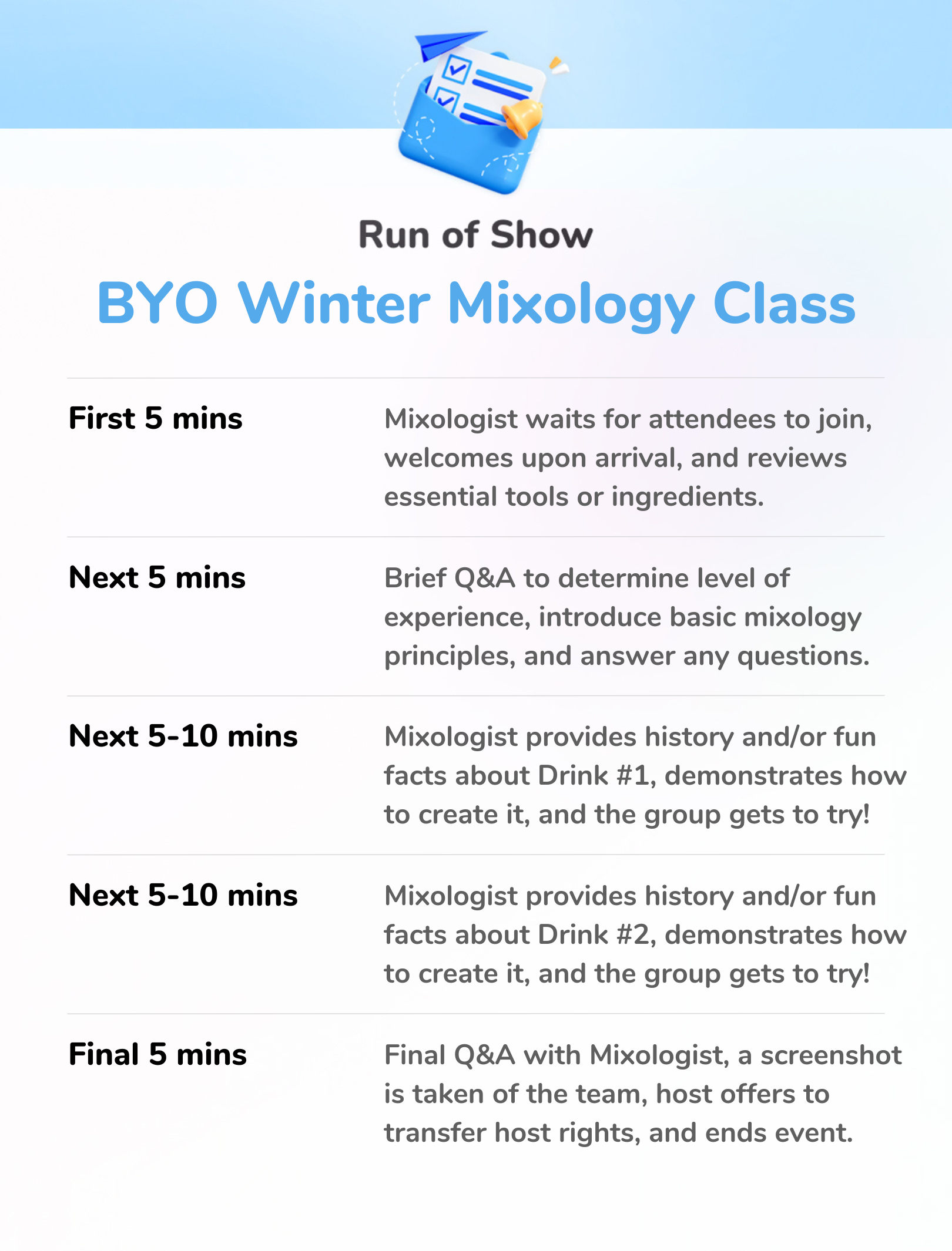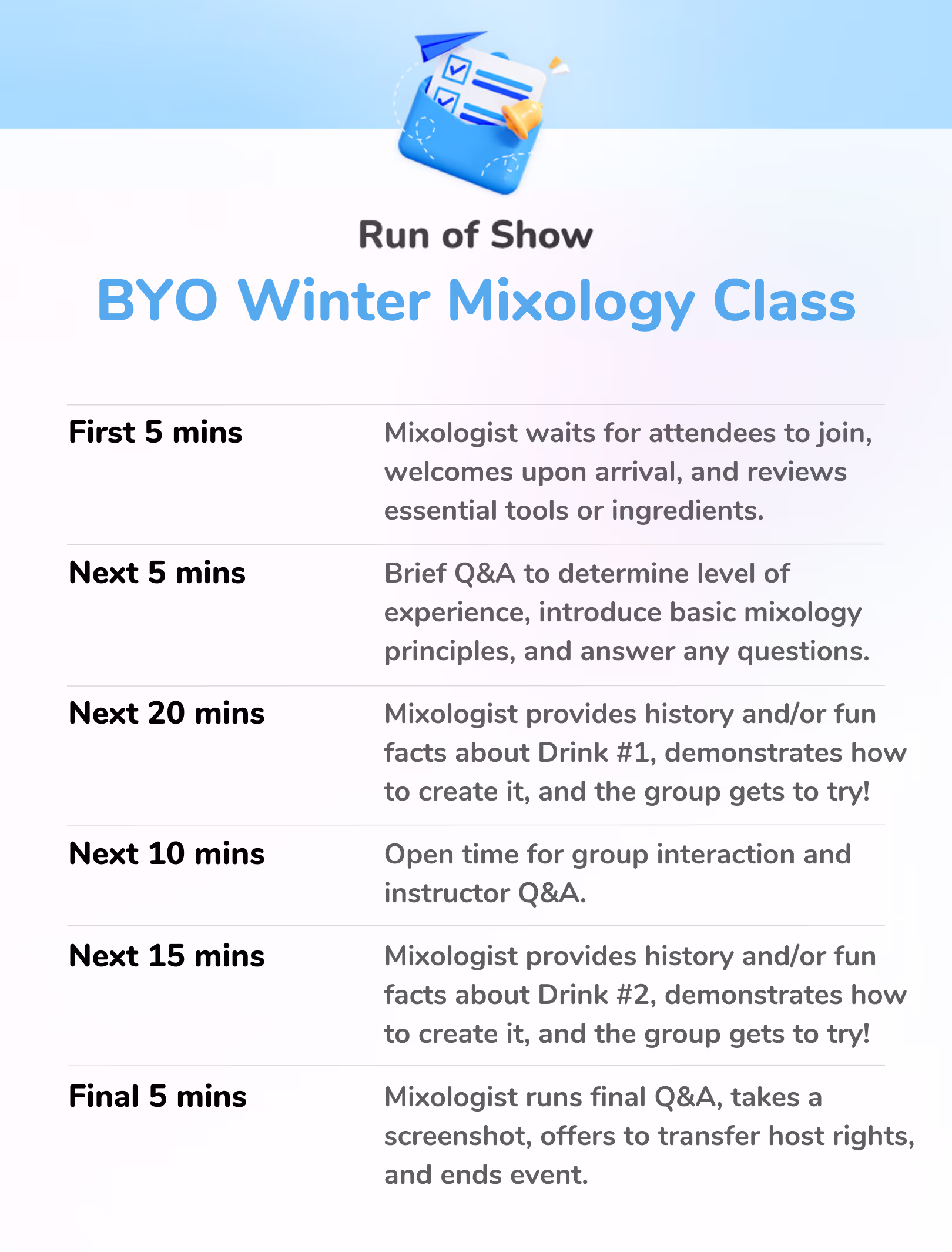 Experience a full 60-minute class with time for engagement and Q&A. Our instructor will provide an in-depth demonstration of how to make both cocktail recipes. See the run of show.