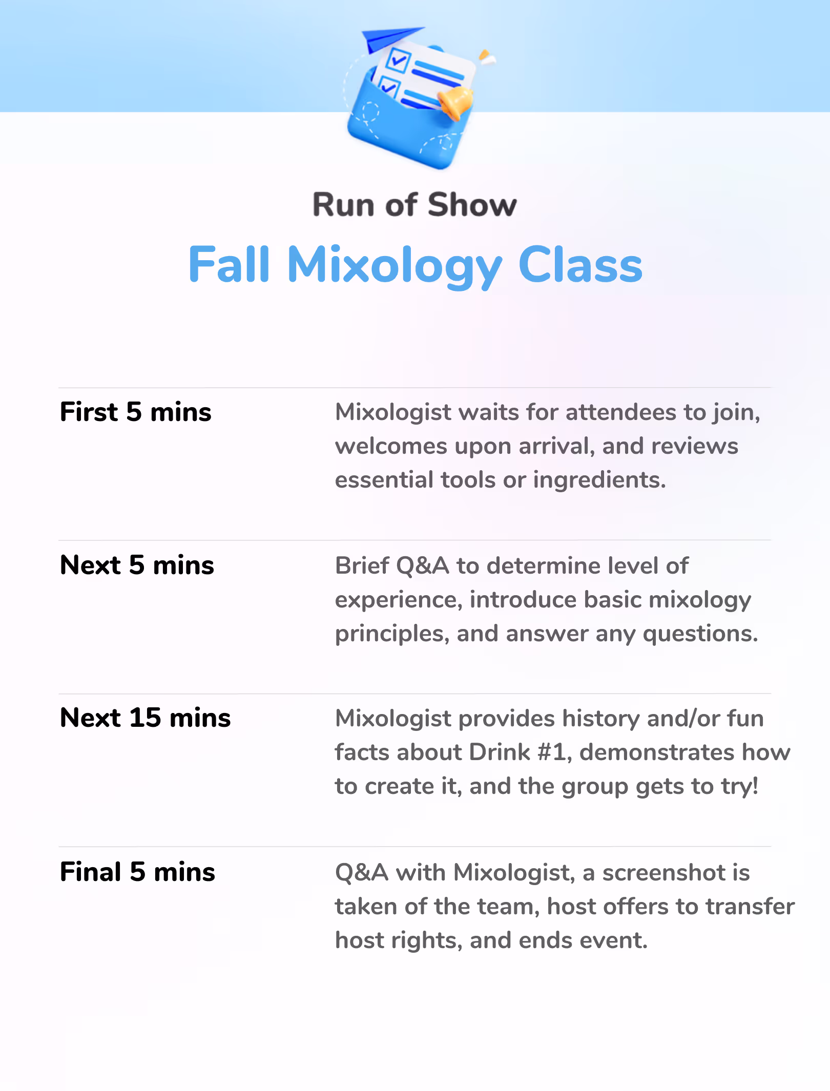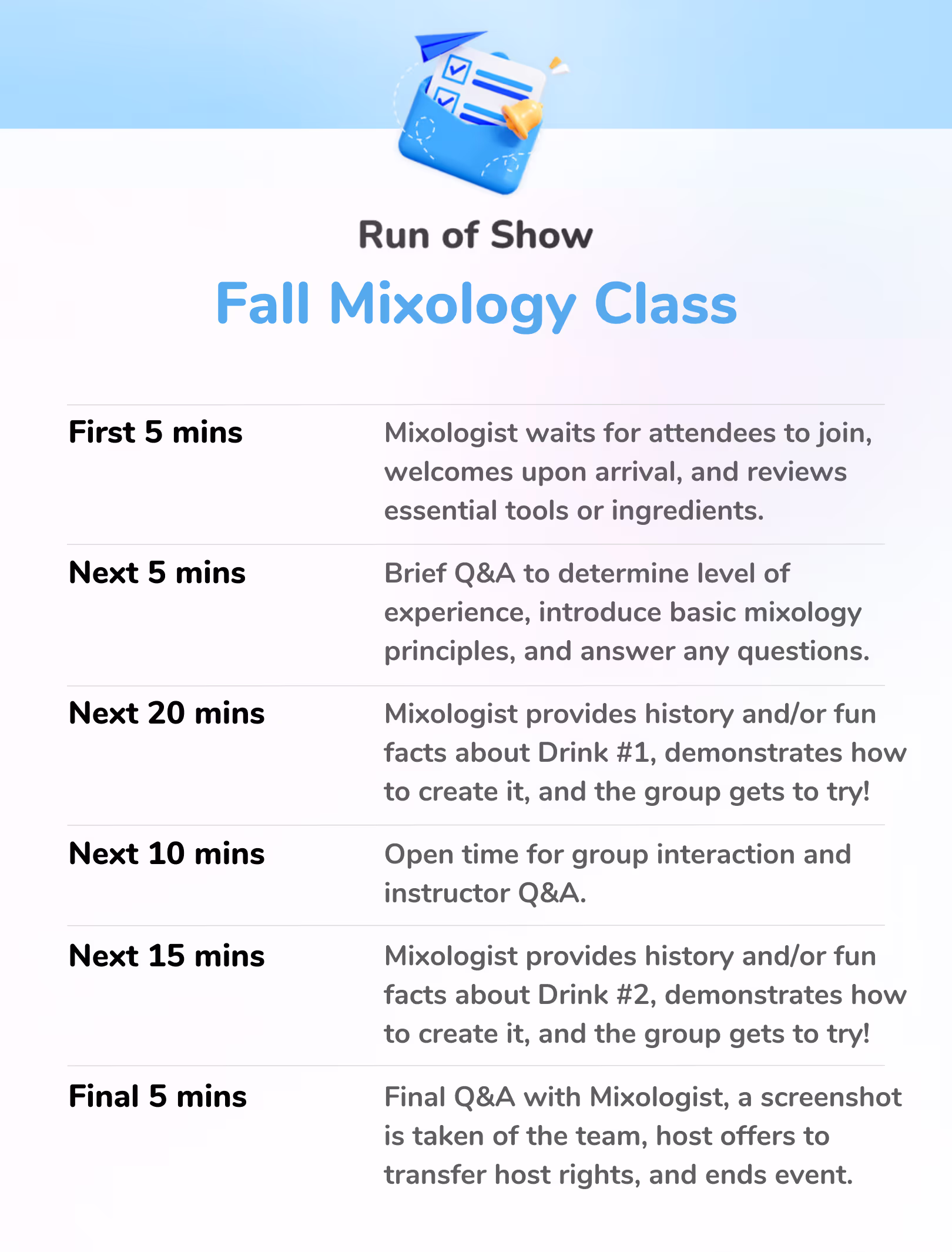 Experience a full 60-minute class with time for engagement and Q&A. Our instructor will provide an in-depth demonstration of how to make both cocktail recipes from your kit. See the run of show.