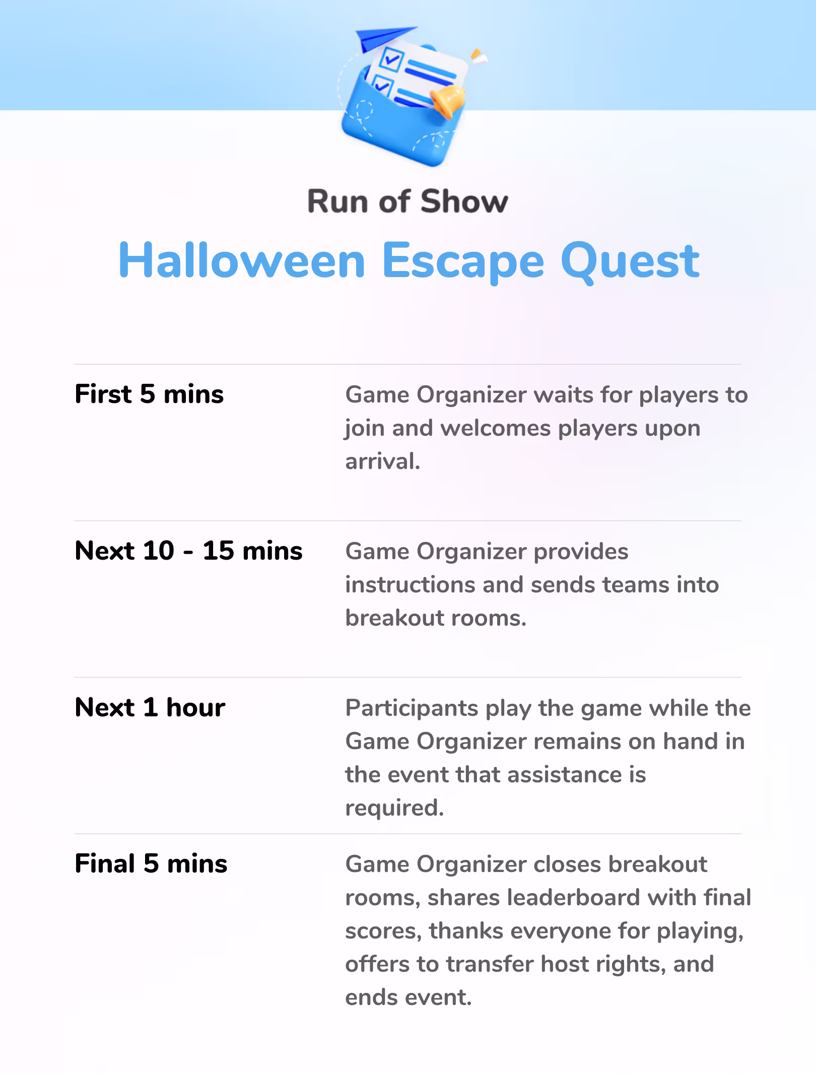 To begin, our game organizer will introduce participants to the Halloween escape quest instructions and backstory. Teams will have 60 minutes to complete the quest. For each puzzle, submit the correct answer to proceed to the next clue and ultimately solve the mystery.