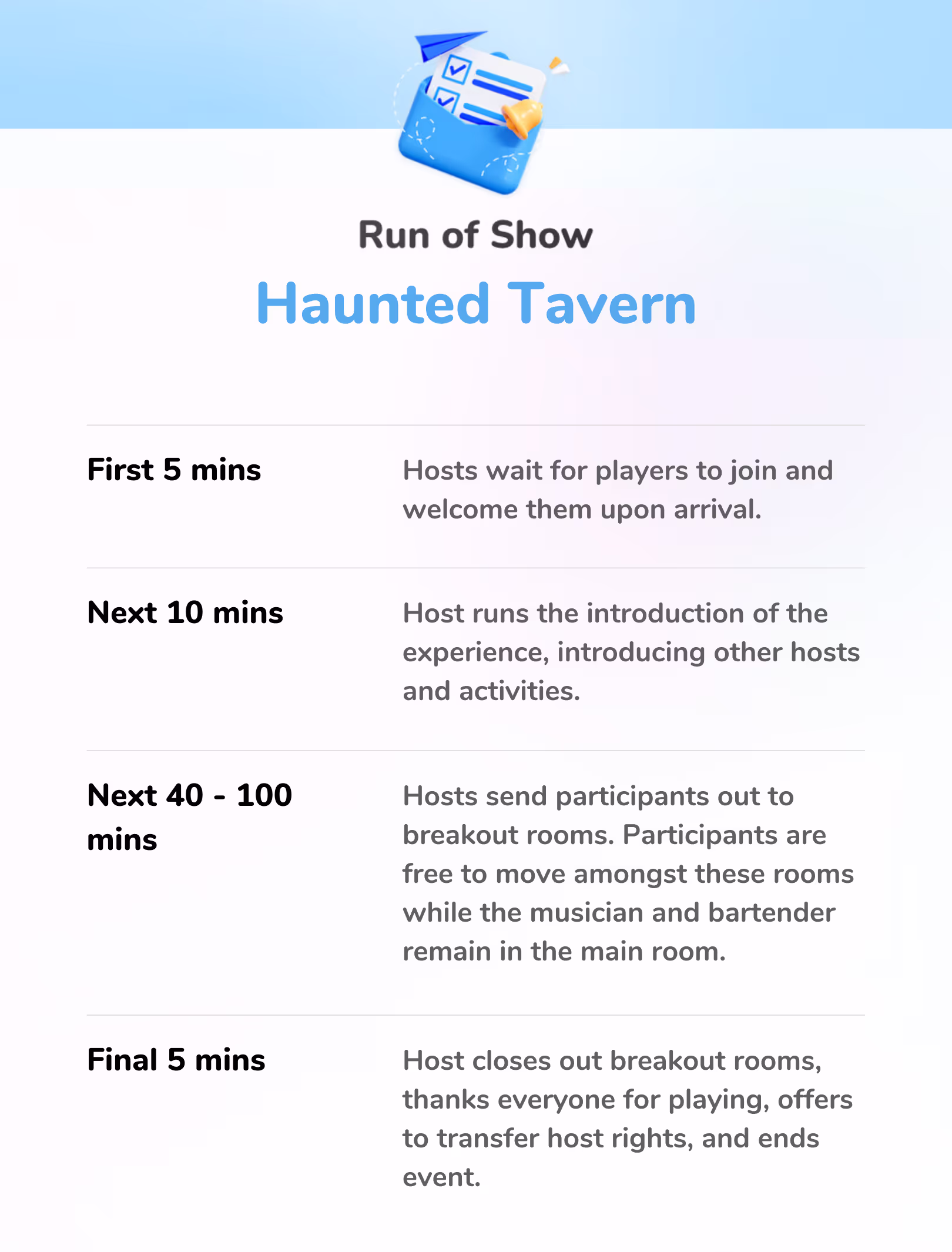 Meet your team at the Haunted Tavern, where our friendly boo-tender will give you the rundown! 👻 We will have a handful of breakout rooms with different virtual Halloween party activities, which people can swap in and out of to create their own adventure: