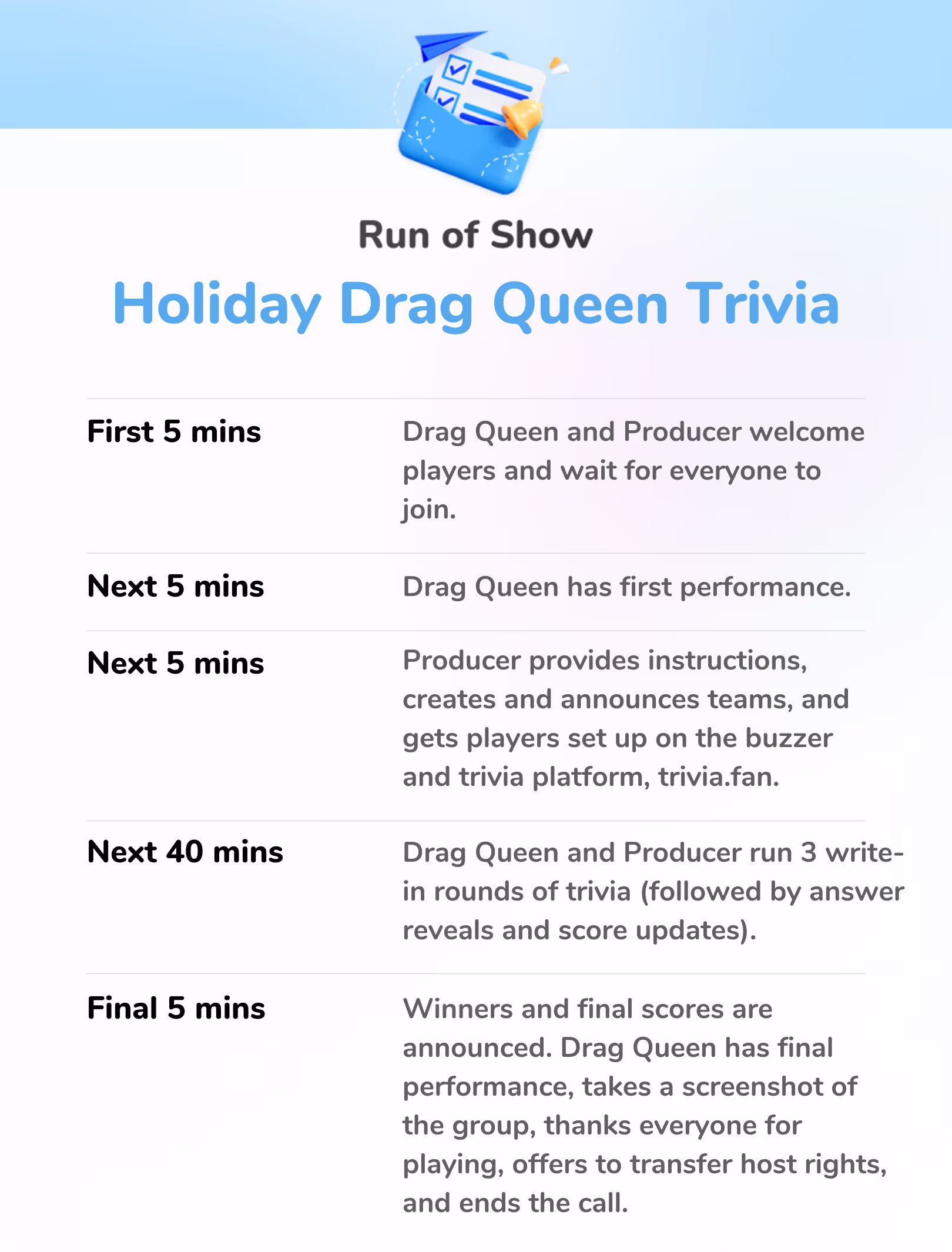 Simply hop onto a video call where your team will compete in a live game of trivia and enjoy a fierce performance from our exquisite drag queen — all at the same time!