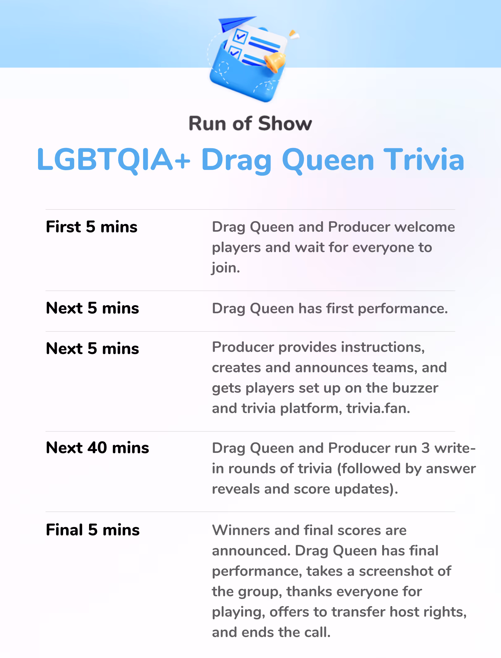 Simply hop onto a video call where your team will compete in a live game of trivia and enjoy a fierce performance from our exquisite drag queen — all at the same time!