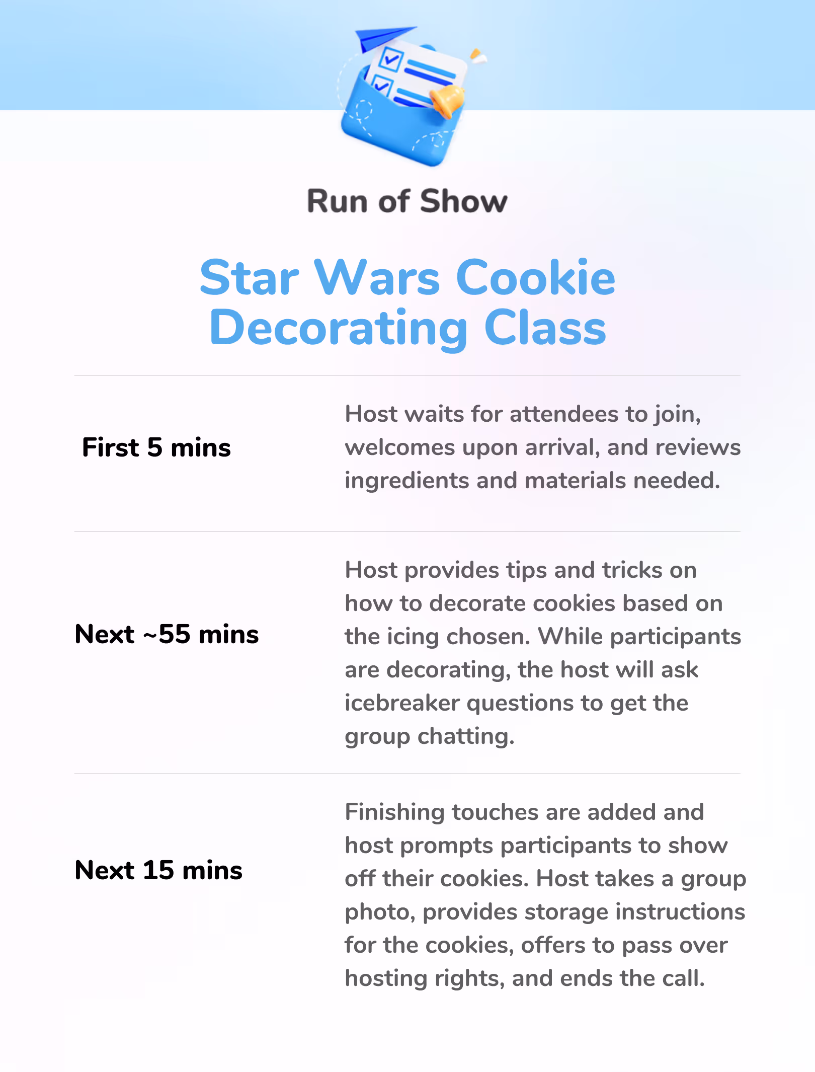 In a virtual cookie decorating class, our expert baking instructor will demonstrate how to decorate themed sugar cookies using the provided kit. Cookies will come pre-baked and ready to decorate in the shapes of your favorite Star Wars characters, such as: