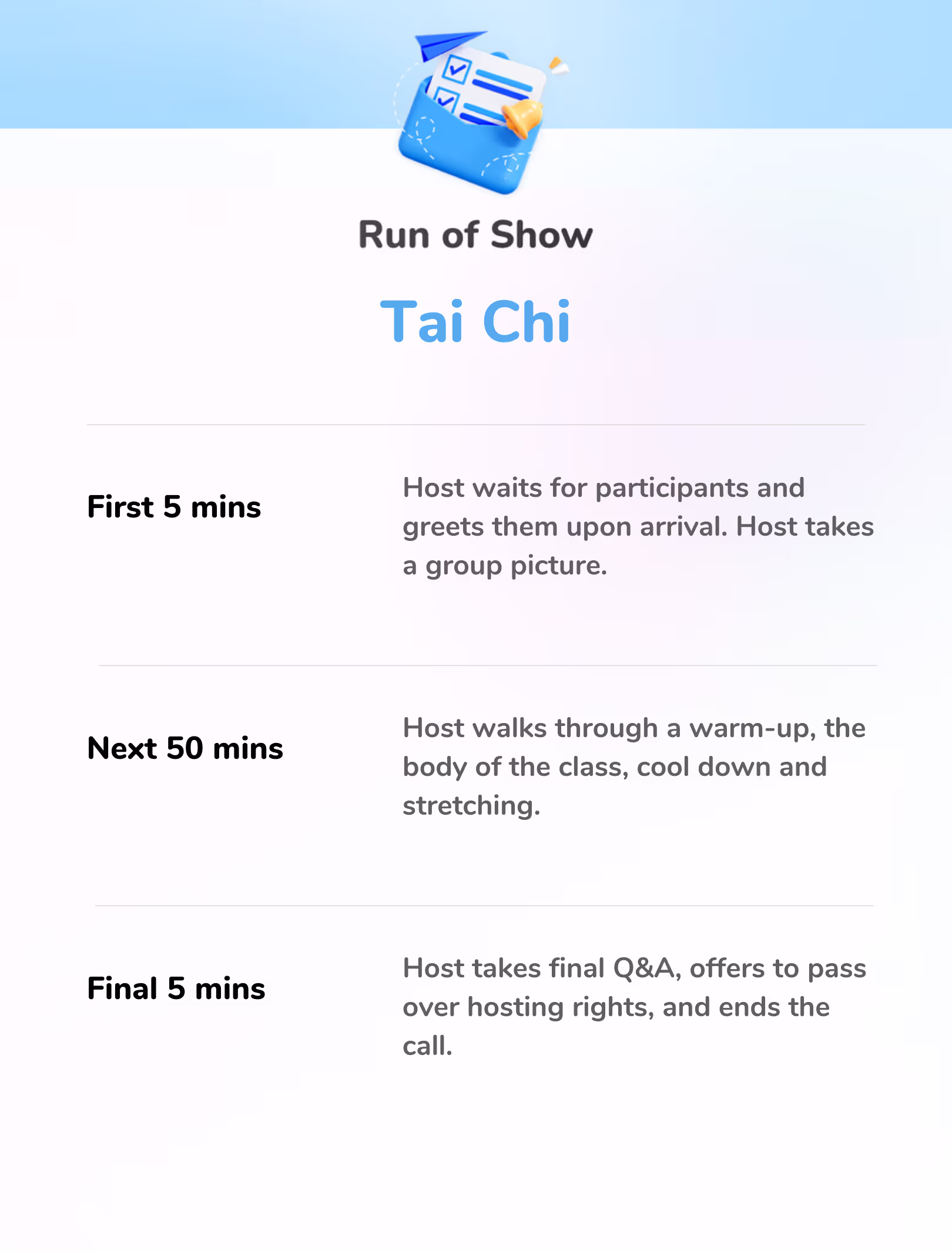 Perfect for a quick midday recharge or end of the day wind-down. See the run of show.