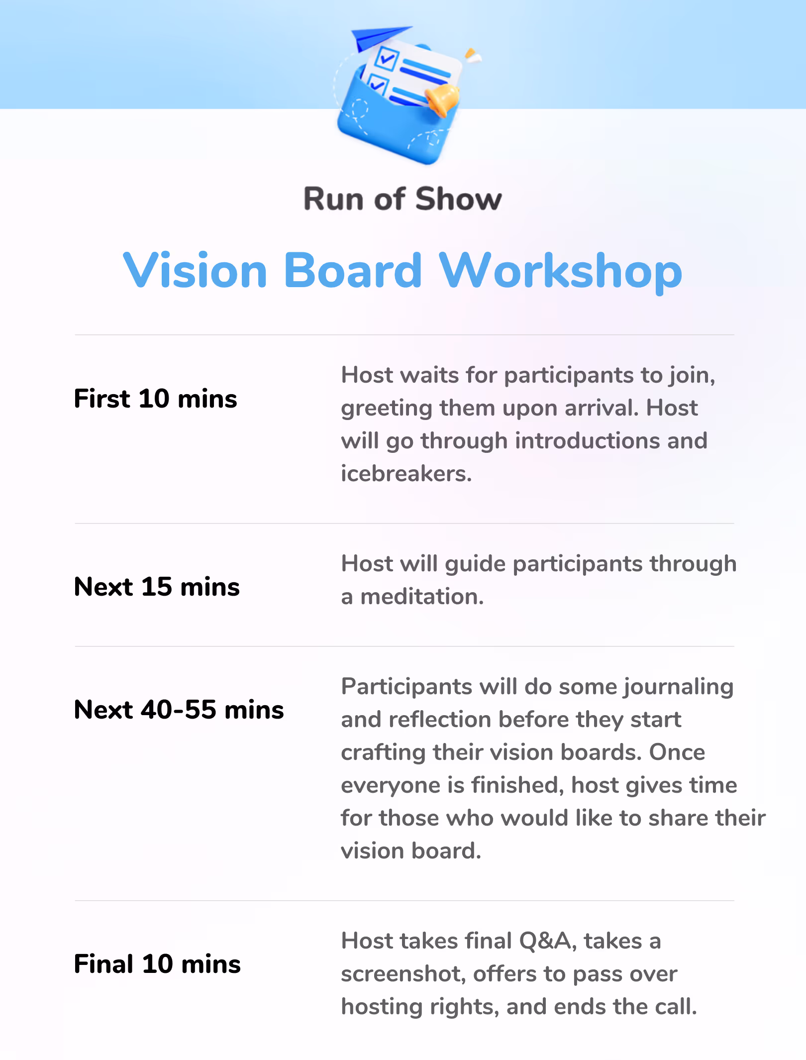 The second half is dedicated to creating a vision board, where participants will transfer their goals into a graphic representation. If you have time, participants will have the chance to share their vision board or key insights at the end.